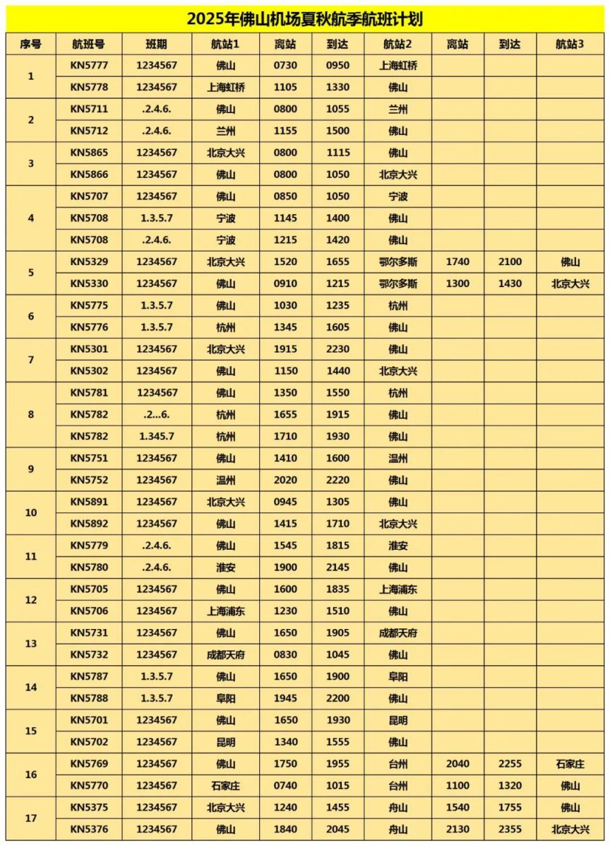 ### 2. 航空公司官网查询 您也可以直接访问各大航空公司的官方网站查询佛山机场的航班时刻: