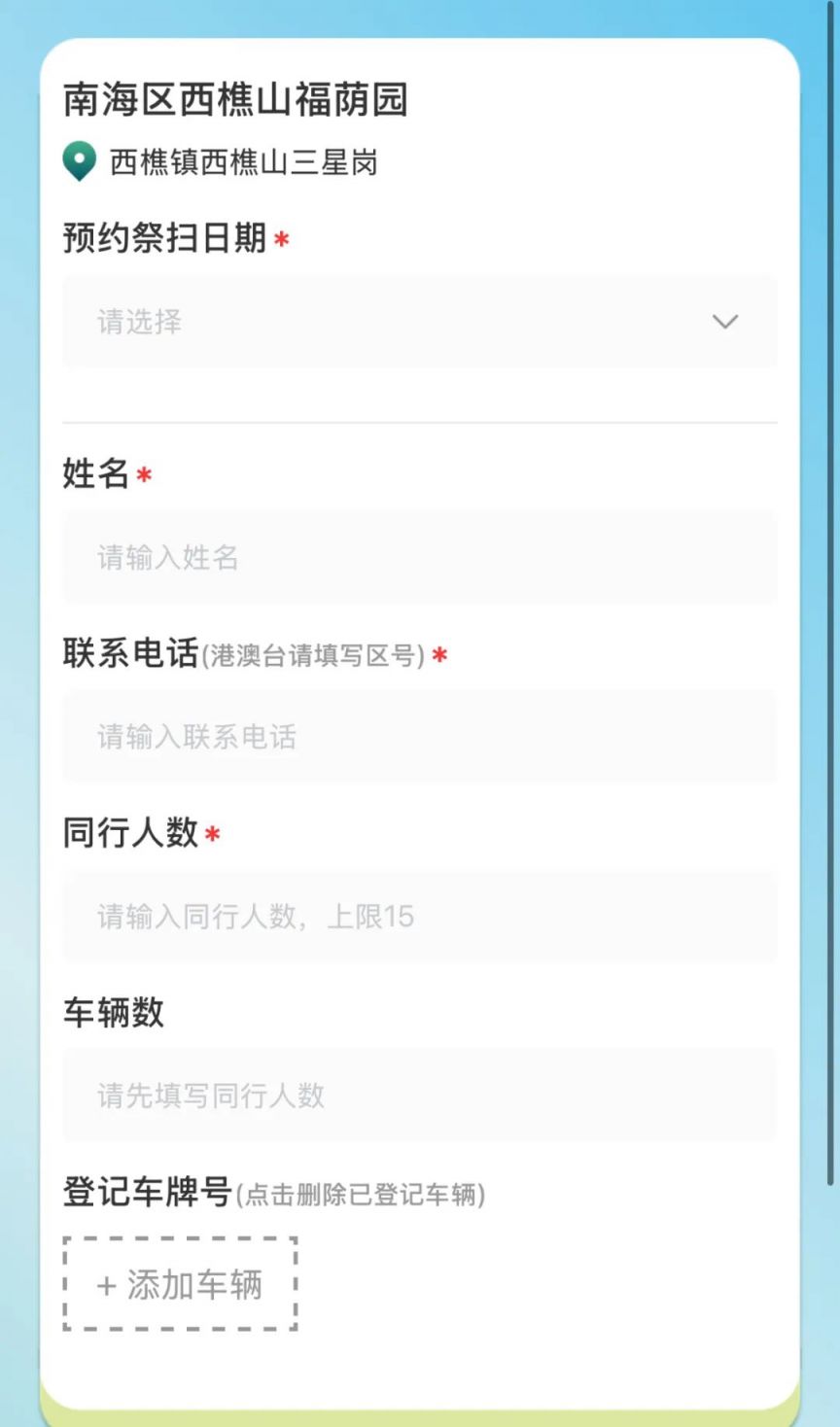 选择祭扫殡葬服务机构,填写日期、姓名、联系电话、同行人数等信息后,提交预约信息。