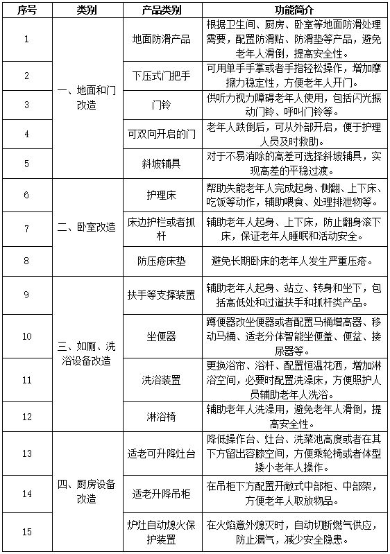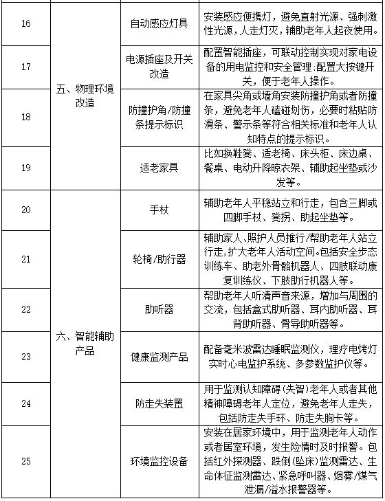 居家适老化改造产品:扶手等支撑装置、手杖、轮椅/助行器、助听器、沐浴椅、坐便器、护理床、防压疮床垫、适老家具(例如换鞋凳、适老椅、辅助起坐垫或沙发等)、防走失装置、环境监控设备(例如红外探测器、紧急呼叫器、烟雾/煤气泄漏/溢水报警器)等,具体参照《2025年度居家适老化改造产品品类清单》。
