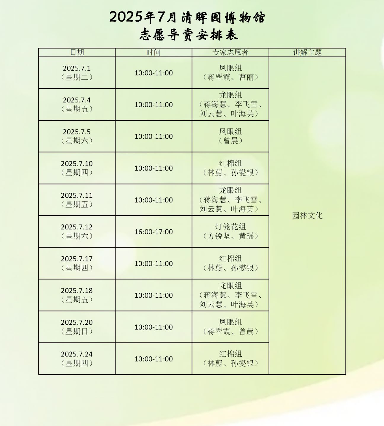 7月清晖园特色导赏之旅每日精选导览时间表如下:
